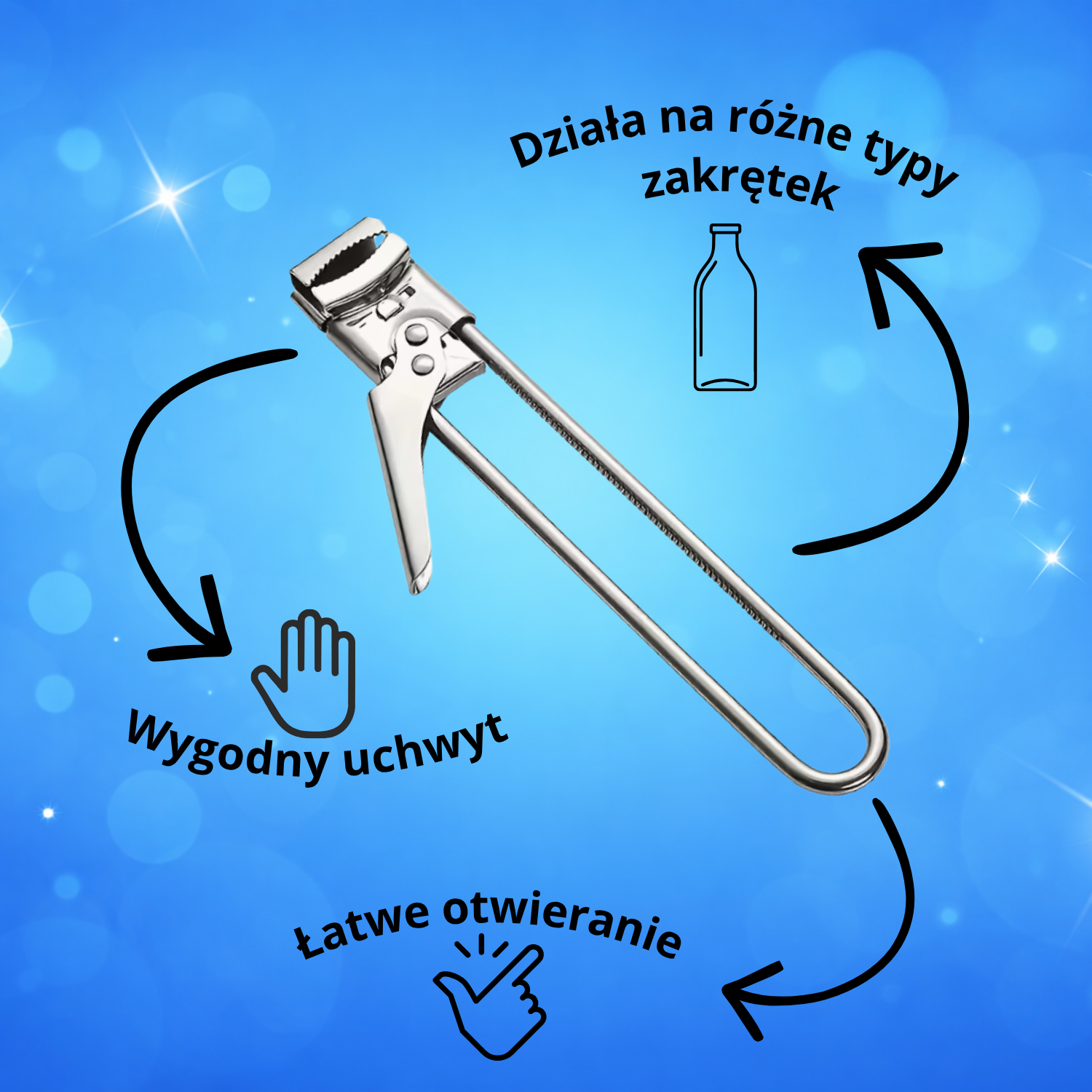 Ząbki zapewniają pewny chwyt bez poślizgu, a regulowany mechanizm dopasowuje się do każdej zakrętki.